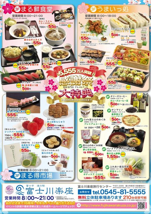 富士川楽座の16周年企画&来場者5,555万人記念イベントとして、「5」にちなんだ大特典商品を多数用意しました。物販、レストラン、フードコート、テイクアウトストアなど、普段よりおトクな商品が多数ラインナップ。