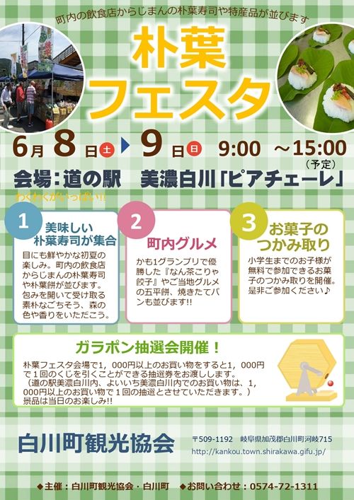 毎年恒例の「ほうば寿司フェスタ」は、白川町内の味自慢のお店が「おらが、ほうば寿司」を持ち寄り、即売いたします。